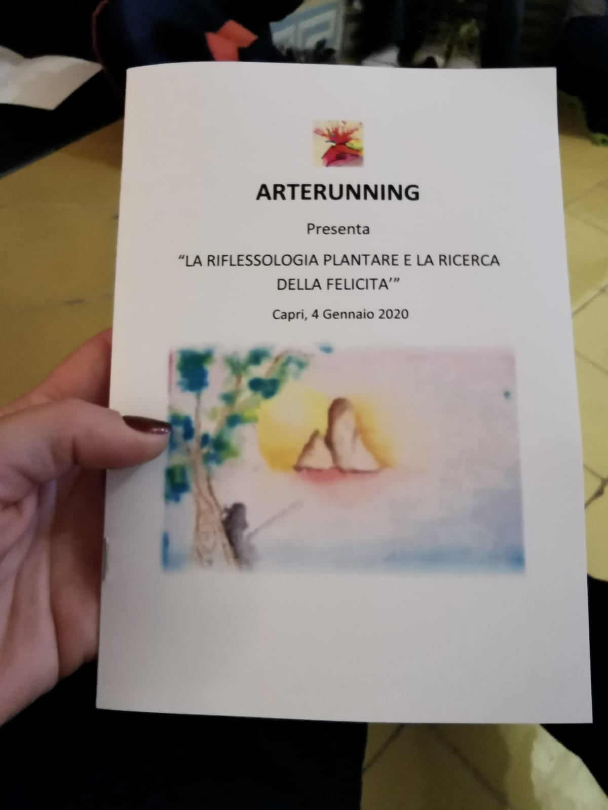 Si è svolto, nella giornata del 4 gennaio, il secondo appuntamento dell’ associazione ArteRunning ASD con Capri. Entusiastica la partecipazione all’ evento, sia da parte dei napoletani che degli isolani. ArteRunning ha letteralmente invaso, con i suoi colori, con la sua gioia di vivere, le stradine, le viuzze di Capri. Una preparatissima, attenta guida caprese, Giusy Perrotta, ci ha deliziato con storie su alcuni luoghi caratteristici dell’ isola nonche’ densi di fascino. Un incontro con un amico, Luciano Garofano, ci ha poi deliziato il cuore.
