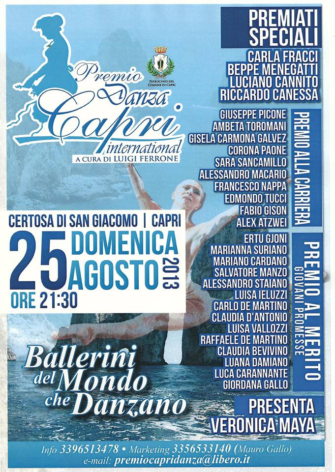 Appuntamento imperdibile è per Domenica 25 Agosto alla Certosa di San Giacomo a partire dalle ore 21:30 per “”Premio Danza Capri International” manifestazione organizzata da Luigi Ferrore, presenta la serata Veronica Maya.