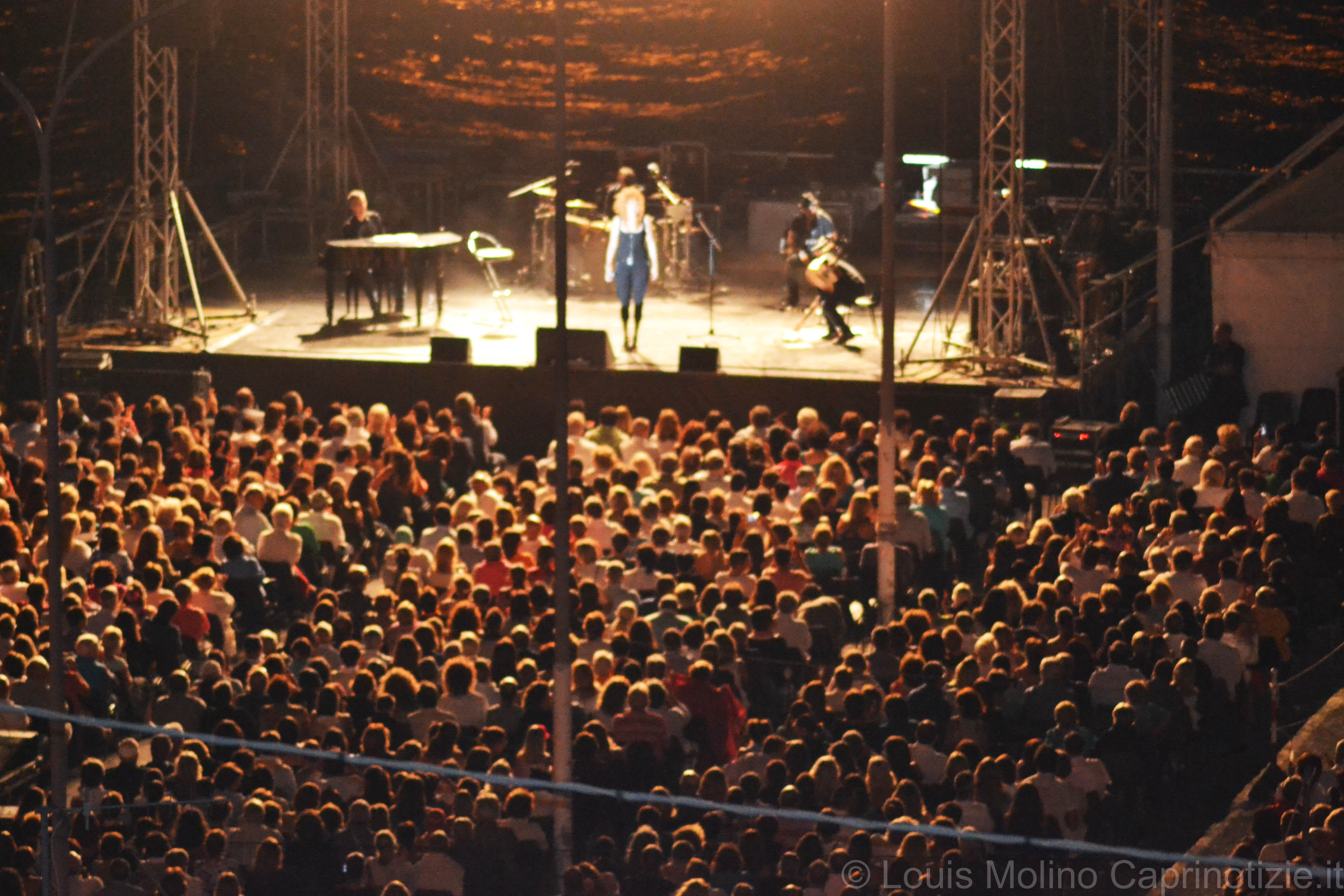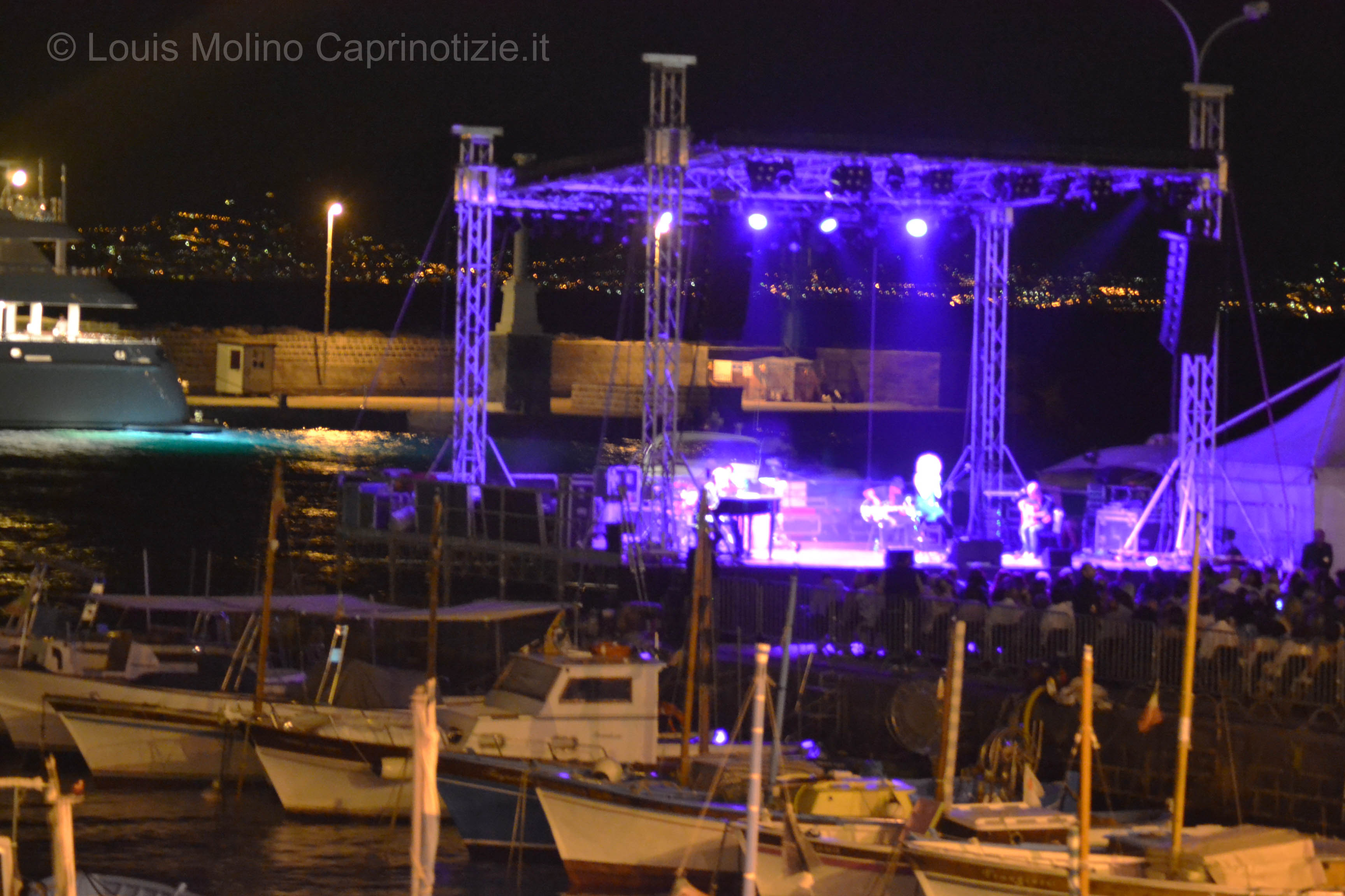 Capri, una serata di grandi emozioni quella appena trascorsa, complice una fresca serata di San Lorenzo lo straordinario contesto del Porto di Marina Grande di Capri  ed una grande artista  Fiorella Mannoia che si è esibita con il suo gruppo di musicisti sul molo proprio dinanzi  all’ esclusivo porto turistico dell’ isola. L’evento ha richiamato come da previsioni migliaia di spettatori, i quali non tutti sono riusciti ad accedere alle quasi 2000 poltroncine situate dinanzi al palco, e la disposizione dei 2 megaschermi lungo la via San Francesco ha permesso a tutti di gustarsi un meraviglioso evento non solo musicale. Evento seguito anche dal mare, decine di imbarcazioni di ogni dimensione ha seguito lo spettacolo dinanzi al molo e ovviamente dai lussuosi mega Yacht ancorati al poco distante Porto turistico dell’ isola.