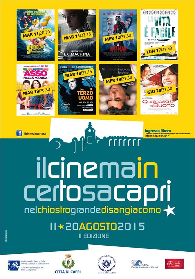 Reso noto il programma de “Il Cinema in Certosa” che trasformerà, dall’11 al 20 agosto 2015, il chiostro grande della trecentesca Certosa di San Giacomo in una suggestiva sala cinematografica en plein air.